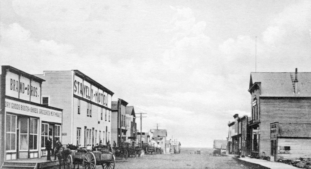 Stavely is a town in southern Alberta, Canada. It lies 110 kilometres (68 miles) south of Calgary on Highway 2 and 16 km (9.9 miles) east of Willow Creek Provincial Park. It is named after Alexander Staveley Hill. The photograph above shows Stavely town in 1910. The town website can be found here: https://stavely.ca/