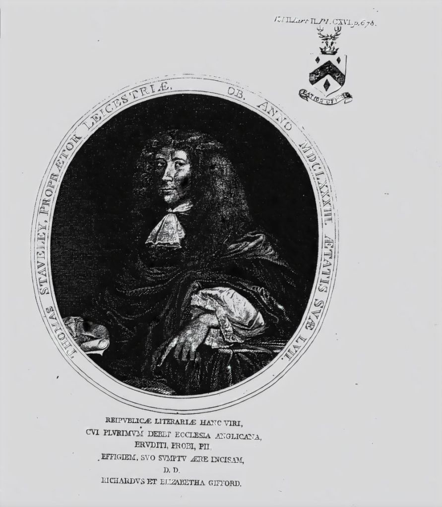There are three Staveleys in the Dictionary of National Biography (which I shall abbreviate to DNB). The first of these in time is this Thomas Staveley. He is described as an antiquarian and historian. He was born at Cossington, a village about six miles north of Leicester, where his father, another William, was rector. Thomas, who spent most of his life in or near Leicester, was a Justice of the Peace, and also Steward of the Courts of Records. He wrote several books, one being a History of Leicestershire, which (quoting the DNB) ‘included a curious pedigree of the Staveley family drawn up in 1682’. This book could probably be found in the British Museum (or maybe in the National Library), and perhaps also in the archives in the main library in Leicester. Thomas was buried in St. Mary’s Church in Leicester.