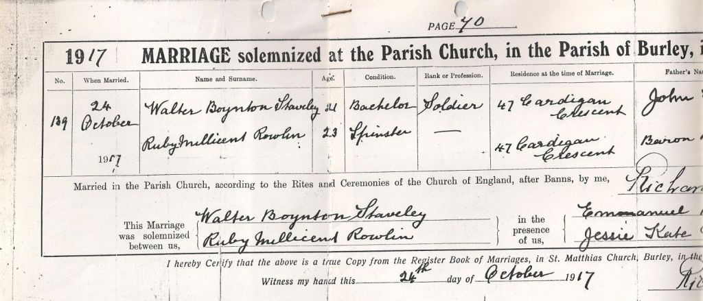 When Ruby Millicent Rowlin married Walter Boynton Staveley on 24th October 1917 in Burley, Leeds, the marriage certificate is witnessed by Emmanuel Butcher and Jessie Monkman. Baron Rowlin at this point is listed as a munitions worker. Both Walter Boynton Staveley and Ruby Millicent Staveley are listed at the address 47 Cardigan Crescent.
