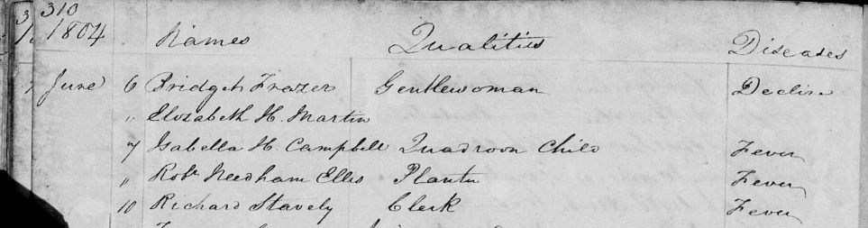 1804 – 10th June – Richard Stavely burial in Jamaica. He is listed as a clerk who died from fever. Perhaps he was keeping merchant records for his Staveley family business back home in England? Ref: Kingston Burial Records – Volume 2, page 310.