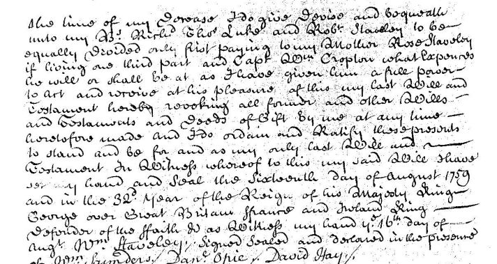 Note: William (1729-1765 ) leaves a will dated 5th May 1766 which calls into question the death date of 1765. It is is extremely hard to read. It provides a wife with a yearly annuity of £4 and there is some reference to a provision for a Mary and Elizabeth which would probably be Luke’s wives. The will mentions his mother Rosamund as Rose and shares his property equally with his four brothers Richard, Thomas, Luke and Robert equally. There is also a reference to a Captain Croplon.