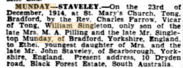 Another advertisement is placed under Silver Weddings in the Adelaide Advertiser on December 23rd 1939 – MUNDAY-STAVELEY – On 23rd December 1914, at St Mary’s Church, Tong. Bradford. William Singleton, only son of the late Mrs M.A. Pilling and the late Mr Singleton Munday of Bradford, Yorkshire, England to Ethel, youngest daughter of the late Mr John Staveley of Scarborough, Yorkshire, England. Present address, 10 Dryden Road, Black Forest Estate, South Australia.