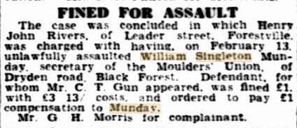 In 1941 the family is still living at Dryden Road. William Singleton Munday is mentioned in the news when he is assualted by a Henry John Rivers and receives compensation. At this time he holds the position as secretary of the Moulders Union. The Federated Moulders Union was a fairly militant union representing moulders – skilled tradesmen who fabricated the moulds for casting metal products in foundries.