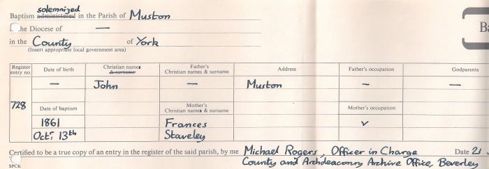 William appears to have been born out of wedlock. He was christened in Muston on October 13th 1861 where the father is not named on the record. In actual fact, Frances Proctor was now living with a Richard Jenkinson but we have no idea if they were to get married.