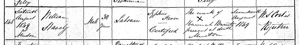 By 1848 the family had moved to Muston where William worked as a farm labourer. Elizabeth was born in 1848 at Muston. Again, I have no information to suggest what happened to Elizabeth or her son. At the time of Williams birth Elizabeth was a domestic servant. Willliam Staveley died in 1849 leaving Frances Proctor a widow. The cause of death was Typhus Fever – a group of diseases caused by bacteria that are spread to humans by fleas, lice, and mites. Whilst common in those days it is very rare in modern times.