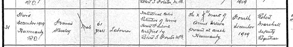 His half brother John Staveley would die from Tuberculosis in October 1909 and Francis had a heart attack and died on the 3rd December 1909. Anne Wilson is present at his death and is witness on the death certificate ( Note: his grandfather married a Wilson ). His wife Elizabeth Staveley ( nee Peam) died in Bridlington in 1913.