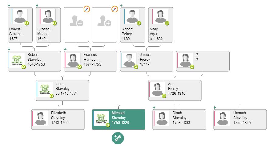 Michael Staveley is the son of Isaac Staveley (1715-1771) and Ann Peircy (1726-1810). He was was born at Kirkburn, Yorkshire. Michael later moved to Nafferton where he would marry Mary Rawson. They had a son called Michael who was born on the 9th June 1773. Unfortunately their son would die in infancy in September 1774. Mary Staveley is thought to have died a year later in 1775.