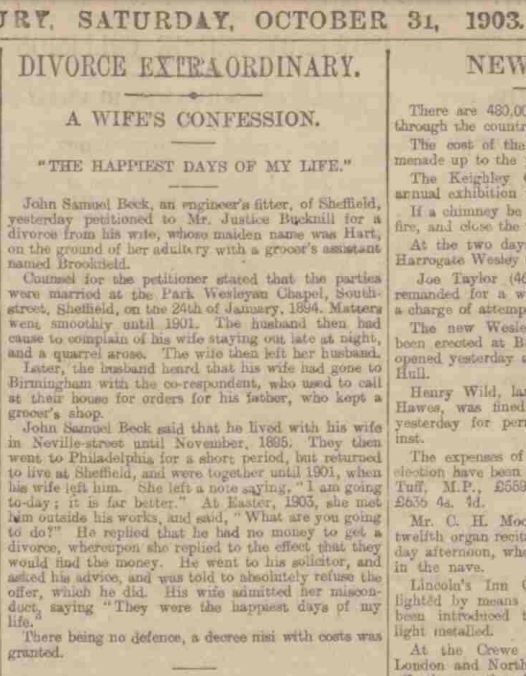 On the 24th January 1894 he marries Mary Anne Beck nee Hart at the Park Chapel and in the same year their son Wilfred Beck is born on the 29th October 1894. They are living at 16 Neville Street, Brightside, Sheffield until 1895. They then went to Philadelphia USA for a short period prior to returning to Sheffield. Unfortunately this marriage has no happy ending. By 1901 things are not going well. His wife is staying out late and in 1903 a petition for divorce is served. The local press are eager to report the information which was quite the local scandal at the time.